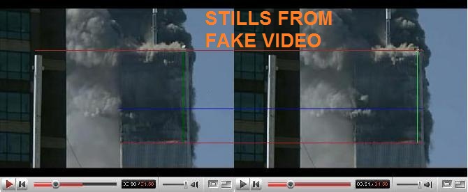 7.7 The rigid upper part above goes missing! NIST and Bazant talk about an upper solid, rigid part above the initiation zone that suddenly falls down as a hammer on all columns below and causes global collapse at a crushing front - actually 280+ crushing fronts - one in each column! This is the second assumption of Bazant: (2) Energy is dissipated only at the crushing front! This implies that the separate parts of the upper and lower part of the collapsing tower may be treated as rigid, i.e., the deformations of the parts away from the crushing front may be neglected. There are many fake videos (animations) of the WTC1 incident but NIST and Bazant never show us the famous upper rigid part at times Tcause (hammer/upper part starts to fall) and Teffect (hammer/upper part hits all the columns below)! It is evidently quite easy to sketch in the rigid upper part at time Tcause, when it starts to drop, on any fake video or fake photo, so that we know what they talk about, and then to do the same at time Teffect, when the same upper part impacts the columns below, to show that the upper part above actually remains rigid, intact and unchanged all the time, while the columns are deformed below it. In below pictures of the initial collapse the assumed initiation zone at around floor 98 is indicated with a blue line. The upper red line is the original roof level. The lower red line is around floor 93. A green vertical line has been added beside the right wall. The upper part is originally between the upper red line and the blue line. Note that all pictures below are from fake, animated videos.