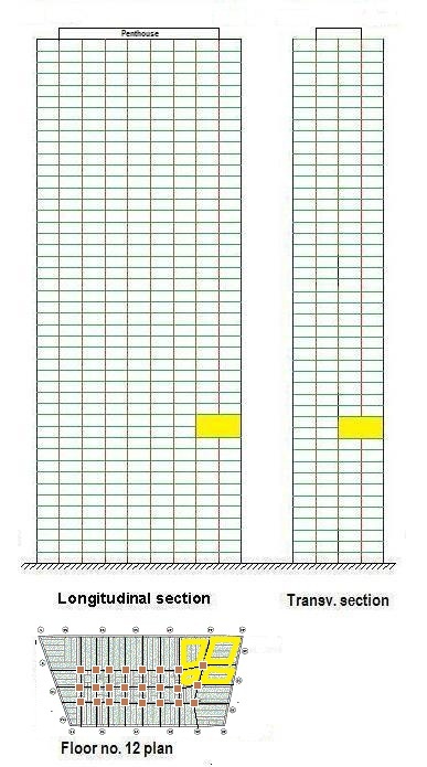 An explanation how the 24 inner pillars/columns #58-81 below floor 14 could suddenly 'disappear' simultaneously to produce the confirmed 32.77 meters free fall of the structure above is given here. The inner pillars/columns #58-81 between floors 6-13, carrying 81% of the total load, simply 'evaporated' at two locations or floor levels due to a compound applied to them that burnt extremely quickly! The load carried by the inner pillars/columns #58-81 was then transmitted to the wall columns! The wall columns floors 6-13, which previously carried only 19% of the load, now carry 100% of it and cannot resist and buckle inward - they are pulled in by the floor beams! - as can be seen in the rubble. It explains the complete lack of parts of these lower inner columns in the rubble and also the presence of molten steel there and very strange looking pieces of junk! Further thoughts about this matter can be found here.