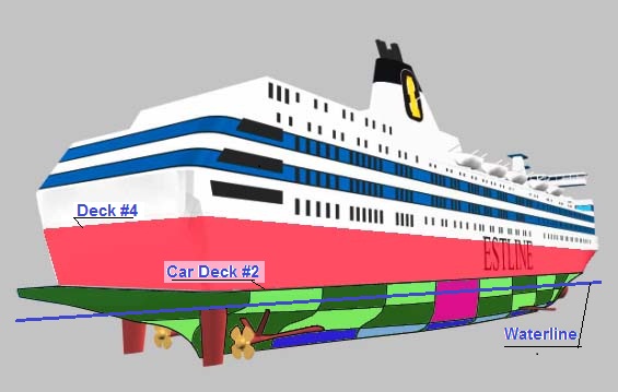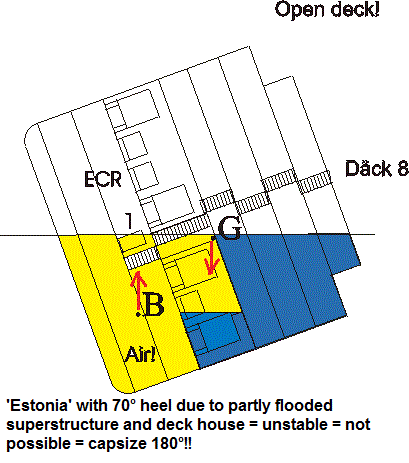 Sjöfartsverket skriver 'överbyggnad' men menar naturligtvis 'däckshus'. 'Estonia's överbyggnad - utrymmet kring bildäcket utan fönster men med vädertäta ramper i för och akter - var naturligtvis vädertätt innan förrampen öppnades. Kommissionen anser emellertid att däckshuset - däck #4-7 inte är vattentätt utan vattenfylldes med 7 000 ton/min under två minuter, nitton minuter efter slagsidan, men att sedan denna hastiga vattenfyllnad plötsligt avstannade, så att fartyget flöt stabilt ytterligare 20 minuter på en vattentät del i däckshuset, och Sjöfartsverket (Franson/Selén) anser också att det fanns en mystisk flytkraft i överbyggnaden/däckshuset som hindrade att fartyget slog runt och flöt upp och ned. Hur denna mystiska flytkraft uppstod och vad den bestod av måste naturligtvis utredas för förbättrad sjösäkerhet. M/S Herald of Free Enterprise som kapsejsade direkt med vatten i överbyggnaden 1987 flöt aldrig på sitt 'däckshus'! Franson hävdar också att vattnet i däckshuset rinner ner till utrymmena i skrovet när slagsidan är 90 grader, dvs förbi den vattenfyllda överbyggnaden. För att det skall kunna ske måste vattnet rinna i uppförsbacke, dvs gravitationslagen upphävs! Naturligtvis vet de riktiga stabilitetsexperterna på Sjöfartsverket att Franson ljuger, men med hot och censur har dessa personer tystats. Det är ganska förfärligt. Men ingen reagerar. Lika förfärligt det med. Omöjlig sjösättning av livflottar Fartygets framfart upphörde aldrig varken enligt Kommissionen eller Huss, utan haveristen fortsatte österut med >2.2 knops fart,35 trots att färjan vattenfylldes och borde ha stannat direkt. Kl. 01.30 hade haveristen hamnat i nedan läge enligt slutrapporten (5) med 60 grader slagsida (Huss anser å andra sidan att slagsidan bara var 27° med 1 385 ton vatten i överbyggnaden vid den tidpunkten - se ovan). Det finns naturligtvis inga bevis för att fartyget någonsin befann sig i detta läge, men bilden är illustrativ.