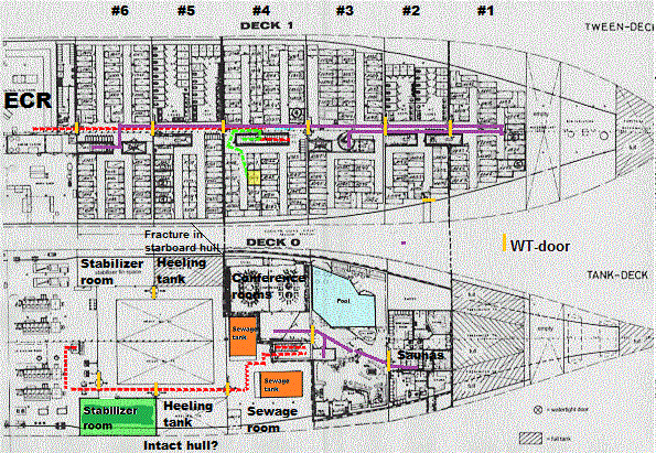 av däck 0 och 1: Däck 0 och 1 - M/S Estonia 1994 och sjöman Lindes vaktrunda. Varje timme kom vakthavande sjöman Linde ner genom trappan till däck 1 och utrymme #6 och gick genom fem öppna vattentäta dörrar (WT-door) till utrymme #1 och sedan tillbaka till utrymme #3 till spiraltrappan ner till däck 0, där Linde kontrollerade utrymmen #2, 3 och 4 genom två öppna vattentäta dörrar (WT-door) för att sedan ta hissen i utrymme #3 upp till däck 9. Hela arrangemanget med sju öppna vattentäta dörrar var 100% olagligt. Dörrarna skulle alltid vara stängda till sjöss och alla däck 1 utrymmen #1-6 för passagerare skulle ha haft två skiljda trappor upp till däcket ovan av säkerhetsskäl. Överlevande Carl Övberg bodde i gul hytt i utrymme #4 och sprang upp via trappan och noterade att vatten sprutade upp där. Däck 0 är 3.6 meter under vattenlinjen. Däck 1 är en meter under vattenlinjen. Passagerare i utrymmen #1, 2 och 3, för att nå livbåtarna, måste först ta trapporna till däck 2, sedan backa till bara en trappa som leder till däck 7, där man hamnar i en korridor som bara mynnar på styrbordssidan - ett helt livsfarligt sätt att ôverleva. Under avdelningar #2-3 på däck 1 befann sig saunautrymmet och simbassängen för passagerare. De hade tydligen vattenfyllts utifrån, eftersom överlevande från däck 1 observerade vatten i mittkorridoren, som bara kan ha kommit underifrån - genom trapphuset till saunan, eller ... (se nedan). Orsaken kan ha varit sönderrostade spantförbindningar i sidan mot innerbotten och korroderad skrovplåt som orsakade läckage - spräckt skrovplåt. Sauna/bassängutrymmena var ofta 'våta' och vattnet hamnade naturligtvis i slaget mellan sida och innerbotten, där det kunde pumpas ut med länspumparna. Det utrymmet var en rostfälla. Att reparera sönderrostade spant där innebar att stora delar av inredningen fick plockas ner. Simbassängen tömdes med ett rörarrangemang i själva dubbelbotten. Ett mycket säreget arrangemang. Dubbelbotten är alla passagerarfartygs grundstötningsskydd - man bör inte ha en swimmingpool på den. Och Carlqvist tror att 'Estonia' skadade botten ... många överlevande upplevde de starka smällarna som en grundstötning ... (se nedan). Under avdelning #4 fanns två toalettuppsamlingstankar. Det var troligtvis där på däck # 0 som systemingenjör Sillaste höll på att 'reparera', när slagsidan uppstod (om man tror vad han säger). Sillaste befann sig alltså rätt under passagerarhytten där överlevande CÖ (se nedan) bodde. Sillaste sprang aldrig upp till passagerarna - han kröp - - - - - - tydligen tillbaka genom tre öppna vattentäta dörrar till generatorrummet, där han 'stod till knäna i vatten' (!!) - och tog en stege upp till kontrollrummet, ECR, som befann sig strax akter om passagerarhytterna i utrymmen #1-6. Där träffade han två kollegor. Ingen av dessa brydde sig om passagerarna förut på däck # 1. Under avdelning #5 befann sig styrbords krängtank som var tom. Styrbords krängtank var också en rostfälla med ständigt litet vatten i botten. Under avdelning #6 midskepps befann sig stabilisatorfenan i en låda som hade svetsats in i februari 1994 - 8 månader innan olyckan - ett snabbjobb utomhus i torrdocka mitt i mörkaste vintern. Recensentens hypotes att läckage i swimmingpoolutrymmet/saunan, toalettankarna eller vid stabilsatorerna orsakade olyckan får viss stöd av Carlqvists redovisningar (se Carlqvists artikel nedan). Det kan mycket väl ha varit så att läckage uppstod in i bassängutrymmet/saunan som vattenfylldes så att vatten spillde upp på däck # 1. Sedan spred sig läckan - sprickan i sidan - först förut in i saunautrymmet under avdelning, vilket resulterade i en smäll, men ingen krängningoch sedan aktertut in i krängtanken, vilket resulterade i en andra smäll och snabb krängning, när tanken vattenfylldes med 180 ton vatten. Sedan spred sig läckan in i stabilisatorutrymmet, då krängningen ökade ytterligare. Sedan sjönk naturligtvis fartyget på 32 minuter. All vattentäta dörrar var öppna. Området vid slaget är det högst påkända området i hela fartyget. En spricka där - pga rost i sauna/bassäng-utrymmet - kan mycket väl bli 20 meter lång mycket snabbt. Det hela liknar processen när oljetankfartyg (t.ex. Erika 1999, Ievoli Sun 2000 och Kristen 2001) plötsligt bara spricker mitt itu och sjunker. Carlqvist nämner möjligheten på sid 210 i sin bok och nämner recensentens teori på sid 231 med tillägget att Björkman ansåg att Estonia skulle ha sjunkit med fören först. Carlqvist har tydligen inte studerat Björkmans senaste sjunkförlopp ,där läckage i bassäng (eller toalettank)-utrymmet cirka klockan 00.40 och startade länspumpar leder till slagsida klockan 01.02 och sjunkning på aktern kl. 01.34. Kollision? Carlqvist tror (sid 233 och 259) att skrovläckaget förut orsakades av en kollision med ett okänt föremål ungefär klockan 01.00. Det är naturligtvis möjligt även om min hypotes om läckage, pga sabotage, redan klockan 00.40 är sannolikare. Det var två ordentliga smällar strax innan slagsidan klockan 01.02, som uppfattades som en kollision eller grundstötning av överlevande på däck # 1 och flera andra på övre däck, men tiden mellan smällarna och den plötsliga slagsidan är mycket kort - två à fyra minuter - och att 'Estonia' skulle fyllas med så mycket vatten på så kort tid och förlora intialstabiliteten är svårt att se - hon skulle ha sjunkit betydligt snabbare då. Och Carlqvist tänker inte på att Sillaste upprepade gånger meddelat att länspumparna var igång - en klar indikation att Estonia var läck. Det är svårt att se varför de skulle ha startats mellan smällarna och slagsidan. Det är mer sannolikt att Sillaste hade startat länspumparna före slagsidan (och före kollisionen!?) - och försökte pumpa den läckande Estonia läns. Det finns märkliga observationer som tyd