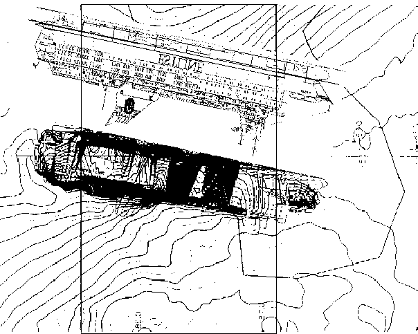 Picture 6 - the M/S Estonia on the bottom of the sea - close-up of the amidships and aft area with the 'wreck' removed It would thus appear that the picture of the 'wreck' was just added on top of the hydrographical (barimetric) chart of the sea floor. If the wreck actually was in suggested location is not certain. And why it was sketched in remains a mystery. But it seems that the sea floor forms a six metres deep depression where the starboard side deck house was located - or has also the depth curves been modified? The original depth curves could otherwise just be extended from the lower left corner to the upper right side showing a sloping bottom without a depression. Another picture is no 7 below. It is the original 'sonar picture' on top showing the 'wreck' at a list - say 120° - showing a bit of the flat bottom and with a profile drawing of the M/S Estonia (thus only 90° list) added below for comparison (not showing the flat bottom). The outline of the wreck fits quite well the profile drawing, e.g. the funnel is in the right position, but the bow area - with the 'pyramid' is strange. We cannot see the extension of the superstructure (the garage - car deck - decks# 2-4), forward of the deckhouse (decks# 4-8) front, with the ramp at the forward end on the 'wreck', because it is covered by the 'pyramid'.