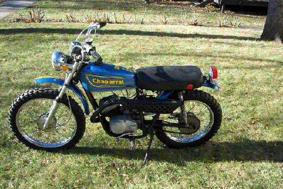 Now here is a really nice minicycle. This is a 1972 Chaparal 100 cc. This belongs to Wayne Rients in Redwood Falls Minnesota. His son Lance sent this picture.This bike was completly restored. Nice job. I certainly would like to own a bike like this. It reminds me of my old Suzuki TS50.