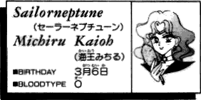 The Japanese translation of Kaioh Michiru's name fits her character beautifully, too. "Michiru" translates to "rising" (like ocean tides?), but it could also mean "complete" and "mature," and indeed she does seem to be the most mature and perfect of all the senshi. (SM fans are divided as to whether they should love her or hate her for this. On the one hand, it's admirable; on the other hand, it's pretty annoying.) Her surname "Kaioh" means "ruler of the sea," which is an indication of her range of expertise as a senshi. It's also related to the kanji for the planet Neptune, "kaiousei."