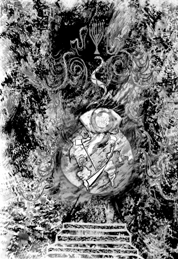 In illustration 5, Perceiving the 70 Nations through the Gate of Dan, we see the letter Ayin superimposed on a map of the world, surrounded by a gate-like structure. In Hebrew, the word ayin means "eye". The eye that appears on the painting reflects a Midrash which describes the white of the eye as an ocean, the iris as the land of Israel, and the pupil as Jerusalem. The innermost center of Jerusalem is the Temple. This universal, discerning eye represents the clarification of sight.
