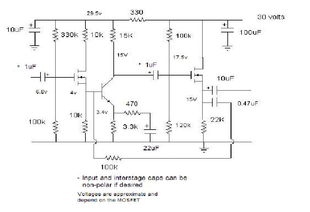 Experiment with the value of the NFB resistor for best results to your taste. If you use a different power voltage, adjust the resistances accordingly. But the 330 ohm for the bypass circuit of the BJT should remain the same. The devices can be any small signal MOSFET with a transconductance of 10,000 or more, and a BJT with a beta of 150 or more. I use the BS170 MOSFET and the NTE-123, both from NTE electronics.