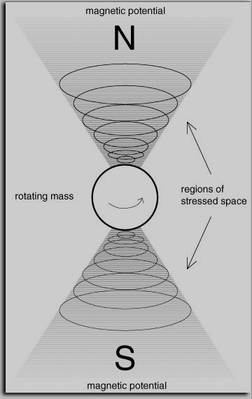 different potential, held in place in space by the source of magnetism. One might also call this phenomenon a distortion or stress of