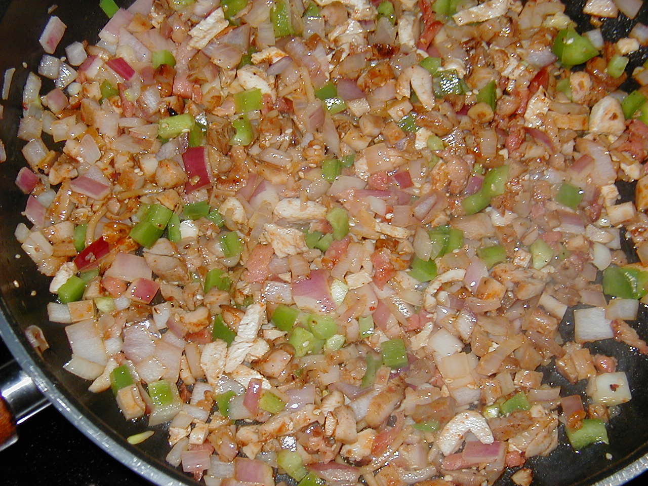 3. When the bacon is "just right," add the onions and cabbage. Sprinkle a little ground red pepper on it then stir it all up real good. Turn the heat to Low and cover the pan to let it all "steam." When it's just about done, add the bell pepper. If you put that in too soon it gets too soggy.