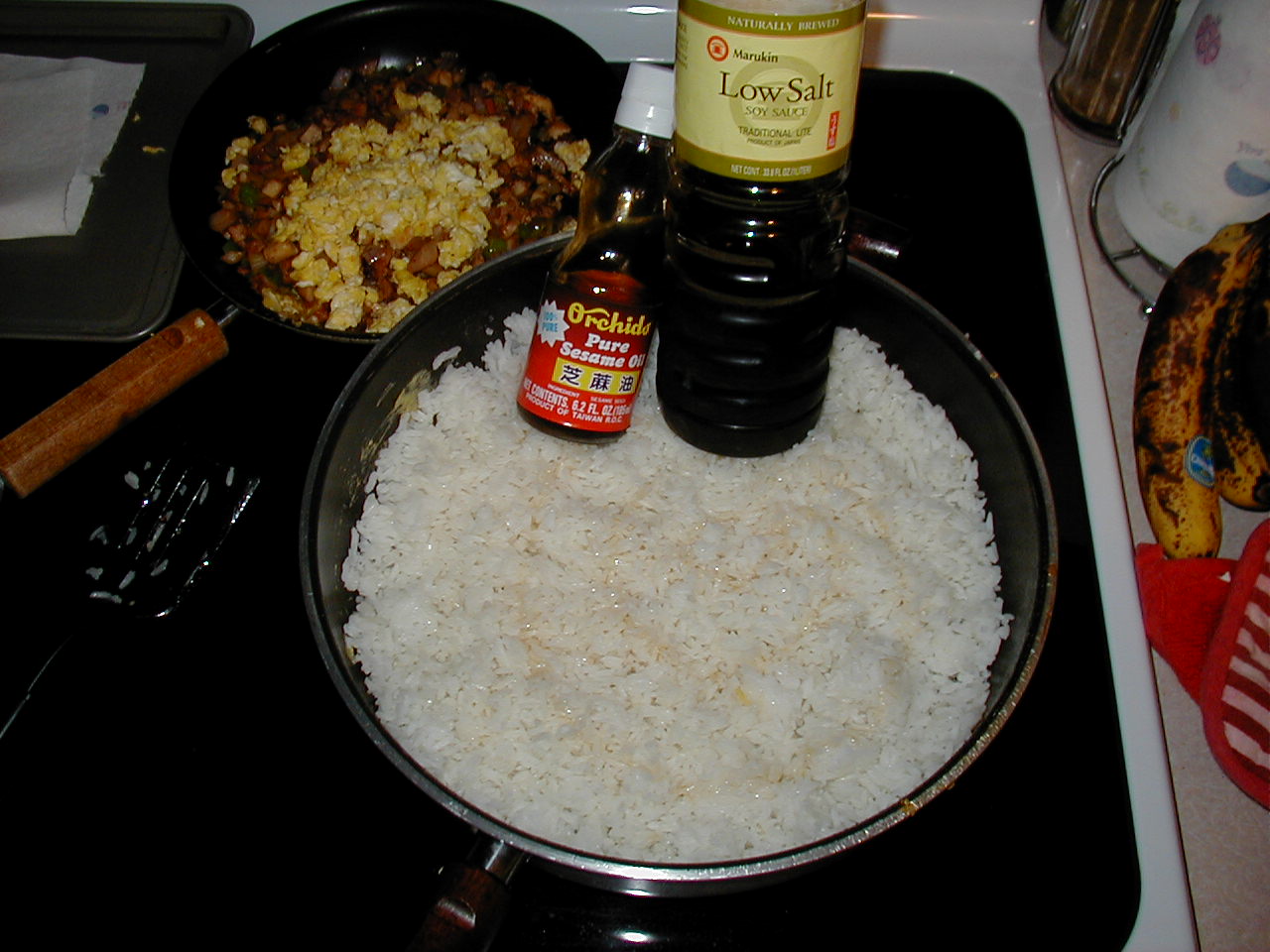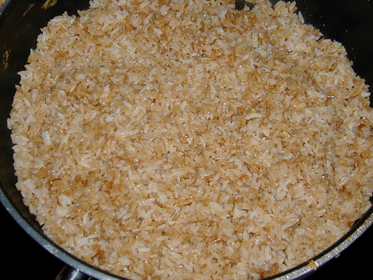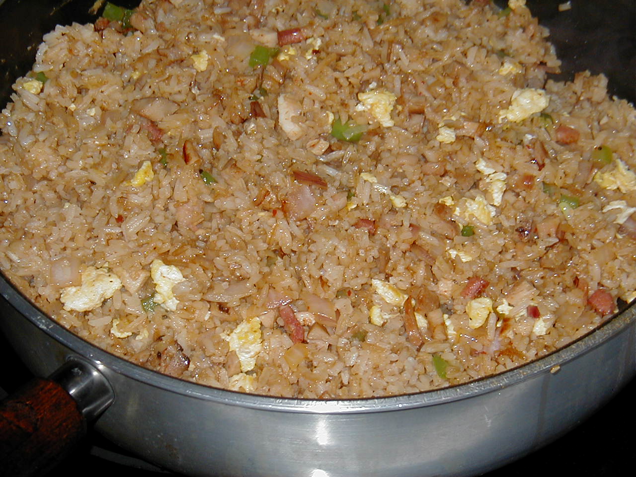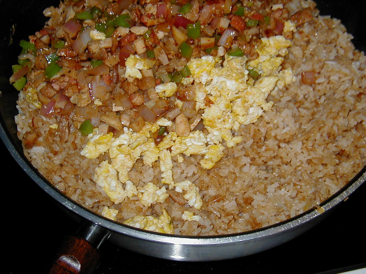 Keep moving the rice/meat combination around in the wok/ pan so that it doesn't burn. I like to leave it long enough to just barely scorch the rice - enough so that it is really fried. Add the eggs last. If you put the eggs in too soon they too will discolor and you'll lose the bright yellow that adds a lot of spark to the appearance of your meal.