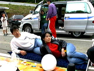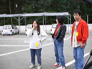 | サーキットに到着。 早朝である。あくびをしているのが浅賀。 |
