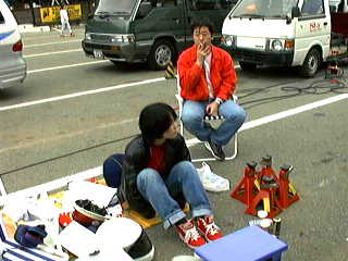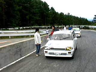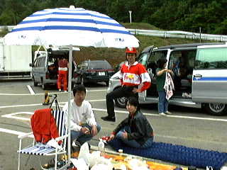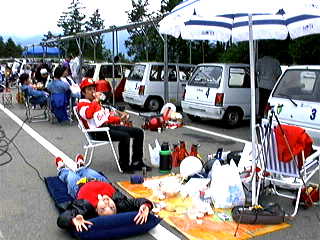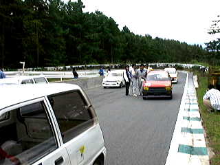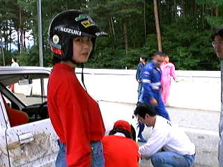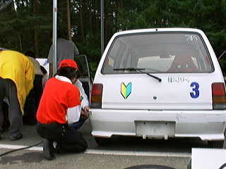 最初に公式練習が30分。一人6〜7分なんだけど、はせがーがいつまでも帰ってこないから私は3周くらいしかできなかった。いや、それよりも公式練習では浅賀が2周目くらいに最終コーナーで尻を振って、後ろから来た車の前に頭を出してしまい、バンパーを吹っ飛ばされた! 派手に吹っ飛んだもんだから、見てる方はヒヤヒヤした。公式練習終了後、飛ばされたバンパーを拾ってきて復旧作業。括ったり、ガムテープで止めたりして、一応形を戻したところ、メカニックの人が飛んできて、「ちゃんとつけてください」とフロントグリルを外しての大作業。これに結構時間がかかっちゃって、予選が始まってしまった。他のチームはガンガンとタイムアタックをしている。うう、時間がない。この時はちょっと焦った。さあ、バンパーの復旧が終わった。公式練習で一番タイムのよかったはせがー一人にタイムアタックを任せた。結果は11チーム中9位。まあ、初めてなんだからこんなもん(?)