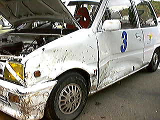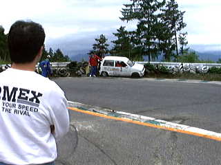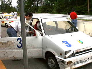 本番でのハプニングと言えば、やはり浅賀。まずは2周目で最終コーナーが曲がり切れず、タイヤの壁に激突。ものすごい勢いで突っ込んだようで、タイヤが空高く飛んだ。車両が見えなかったので、一瞬崖から落ちたかと肝を冷やしたけど、駆け付ける間も無く、浅賀は体勢を立て直して走り始めた。時々よろけていたが、まずまずの走り。順調に周を重ねる...かと思ったら、再び最終コーナーに激突! 今度はタイヤの壁に埋まってしまった。右前輪がパンクして、コース外の土の部分にはまっている。私達チームメイトはもちろん、主催側のメカニックの人達も駆け付ける。浅賀が車から降りたので、「戻れ! 戻れ!」と叫ぶ。タイトな最終コーナー、いつ何時他の車が突っ込んでくるかわからない。戻れと言われて、戻ろうとした浅賀だが、ドアが開かない。慌ててなんとか窓から車に潜り込む。緊急事態ながら、このシーンには笑ってしまった。