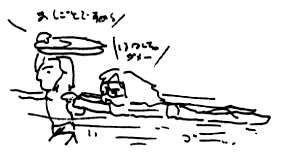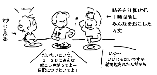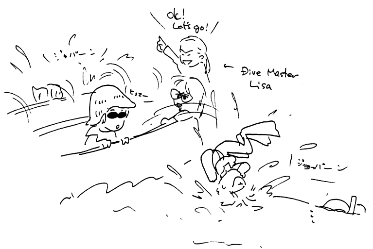 後から写真や玲子さんのマンガを見返してみると、なぜかそこには5人しかいない。万丈さんの姿が見当たらない。要するに万丈さんは朝食を食べた後、First Diveの前の一眠りをしにいったようだ。  |