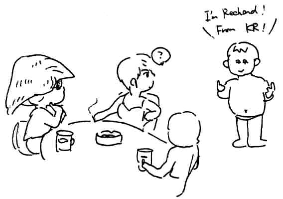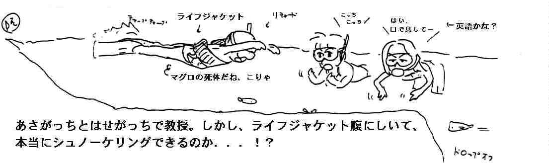 いずれにしろ、私と玲子さんは水流と戦って帰ってきたばかりだったので、ここははせがーと浅賀に任せることにする。(しかし、本当に何を教えるんだ?) 「行ったな」と思ったらリチャードはすぐに戻ってきて、なんとライフジャケットを入手して再び海へ。「おいおい、そんなもんつけたら潜れんだろうが」と私と玲子さん。ま、好きにしなさい。  |
