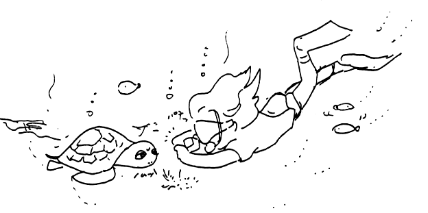 昨日、サリーにボートで連れていってもらったバラクーダポイント方面にチャプチャプと泳いでいくが、途中、カメラのレンズ付近が結露してしまったため、退散...しようとするが、帰りは水流に逆らって泳ぐ形となり、ちっとも進まない。かなり体力を消耗しながら、エントリーポイントよりも随分左の浜辺で上陸し、なんとか宿まで帰還。ふ〜。  |