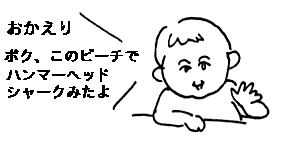 リチャードと玲子さんのやり取りがあまりにも派手だったため、これより24時間ほどテラス全体がハンマーヘッド熱に侵されていた。日本人の女の子3人組はダイブマスターに「ハンマーヘッドが見られる場所に連れていけ」と迫るし、あちこちで「私は見た」「え〜私も見たい!」などと、見た者と見ていない者の立場が別れていく。悔しい。どんどん悔しさが増していく。が、やはりシュノーケリングでは見れない代物なのだと、だんだんと納得する。  |
