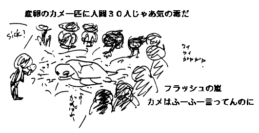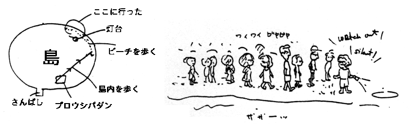 | 最初はビーチと反対側、島の奥に突っ込んでいく。その後、わりとすぐに島の向こう側に出て、そこから反時計まわりにビーチ沿いを歩く。月が出ているものの、とっても暗い。ゾロゾロと結構歩いたところで「静かに。ここに座って」という指示がくる。どうやら今夜の産卵は一匹だけのようだ。亀がそこにいるというのだが見えやしない。とりあえず待てと言われたのでビーチに座り込んで待つこと1時間以上(結局、全部で2時間かかったのさ)。時々、バサッと砂をたたく音が聞こえるがそれだけである。退屈してみんな寝始める。私はちょっと群れを離れてタバコを吸って待っていた。 |
