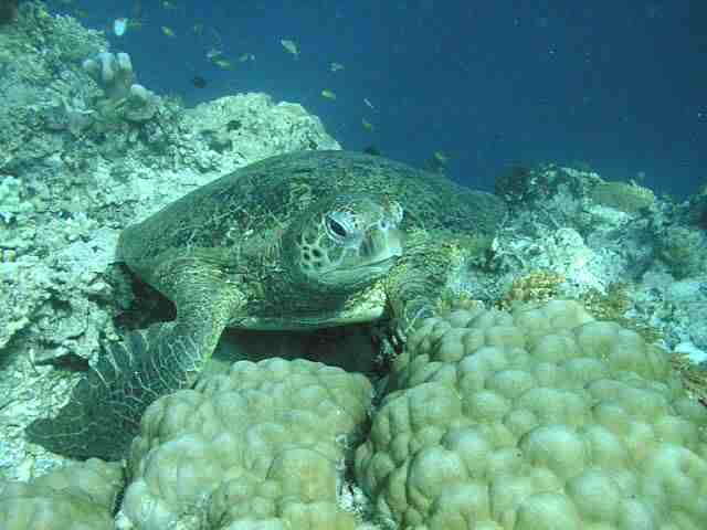 ポイント名は「South Point」(安直な名前だ)。コーラルリーフ(珊瑚礁)にそってTurtle Patch(これもポイント名)方面に泳いで行った。ドロップオフやバラクーダポイントでは見られなかったタカサゴの群れに遭遇。こいつら無茶苦茶キレイ! 海が真青に染まるんだから。(最初っから海は青いけどさ) また、この辺も亀が多く、昼寝をしている大きな亀の正面撮影に成功。  |