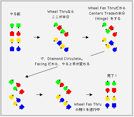 | 今年最後のTAKE 5 の例会。「忘年会をやるよ」ってのがあってか、この日はオールキャストでした(飲み会から参加の人も若干2名いたけど)。夜は「鍋パーティ」ってことだったので、昼頃から浮足立っていたけど、ダンス自体もとっても楽しかった。今日はみんなノリノリだったってのもあったけど、コールの内容もよかったと思う。とっても印象に残ったものをひとつだけご紹介しましょう。 スタートフォーメーションは 8 chain formation。コールは「Sandwitch Wheel Fan Thru Around Diamond Circulate」です。つまり、Wheel Fan Thruの半分のところからDiamond Circulateをして、Wheel Fan Thruの残りの半分をやる。図解します。 ダンスの話はそれくらいにして(おいおい、どこがダンス日記なんだってか?)、要するにこの日のメインは忘年会。ちょっと遅れて来た宴会部長の藤瀬さんは鍋に入れる生物およびサイドディッシュのお刺身などを既に買ってきていた。残りの買い出しは昨年同様(昨年も鍋パーティだったの)昼休みに、ってことで、藤瀬さんが書いてくれたお買い物リストを持っていざスーパーへ。買い出しが終わってからは、ダンスにあぶれた3人がキッチンにこもって仕込みを進めるという段取り。普段は包丁なんて絶対に持たない島内さんも白菜を切ってくれました。 例会のために奈良から出てきている西川夫妻はいつもは終わったら寄らずに帰るんだけど、今日は「6時までなら」ということなので、「じゃあ、ダンスは4時までにして、2時間寄ってきましょうよ」ということにしました。 「4時から」と言いつつ、3時半くらいから既に鍋を火にかけて、4時になった途端、片付けとビールの買い出しに行き、4時15分くらいには乾杯!( ^_^)/□☆□\(^_^ ) あとはちょっとメンバーがいつもより多いけど、その他はただの酔っ払いの集まりということで、いつも通りでした。阿部さんと竹内さんはダンスには参加しなかったけど、飲み会には駆け付けてくれました。西川夫妻はお約束通り、6時過ぎくらいに退散。「じゃあ、僕も6時くらいまでなら」と言って参加した石口さんと島内さんは結局最後までいました。10時半くらいだったかな? 4時から飲み始めても、終わりの時間は結局一緒なのね...。 |